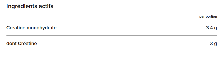 Créatine monohydrate, arôme, acide (acide citrique), édulcorant (sucralose), extrait de spiruline.