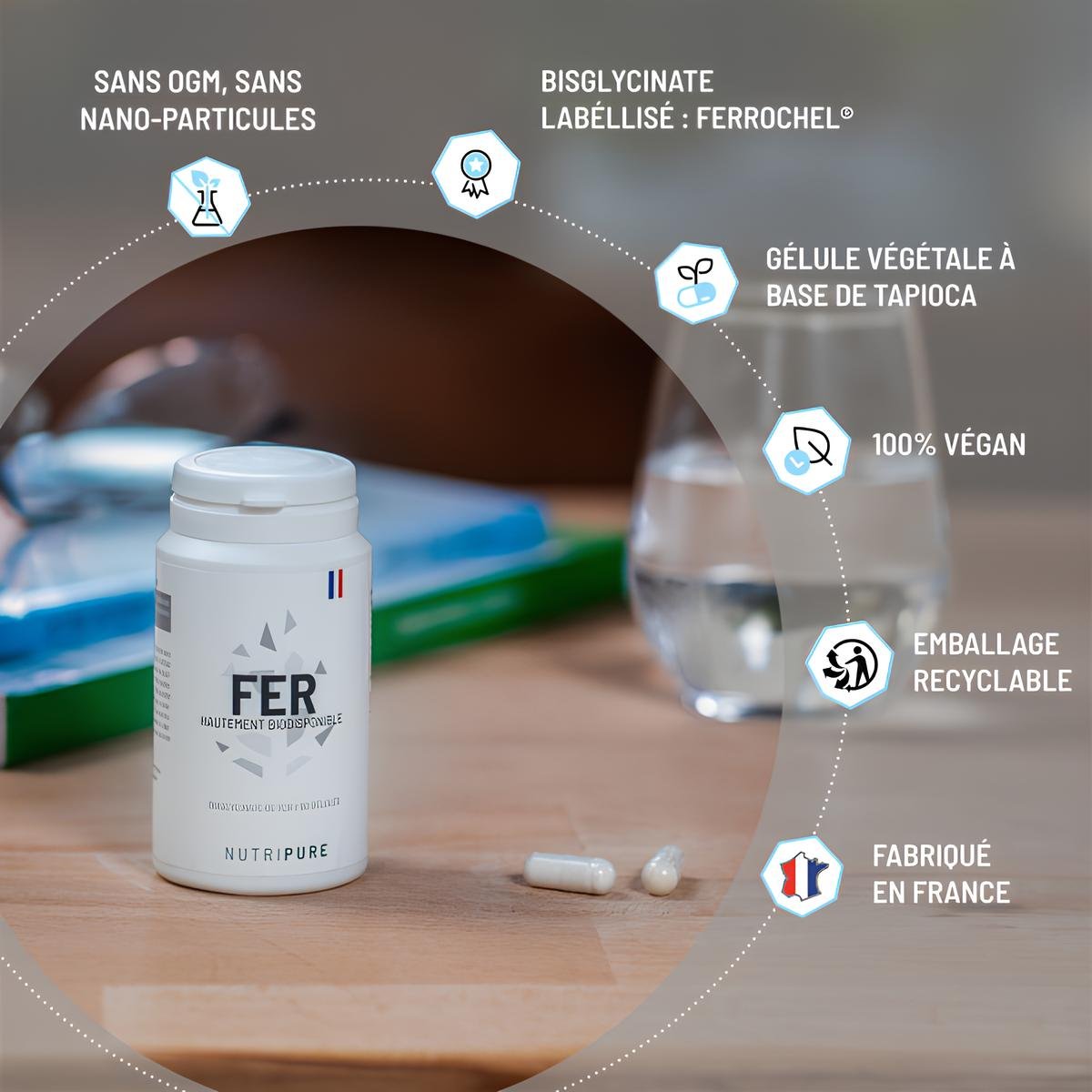 ✅ Forme hautement assimilable : bisglycinate de fer breveté Ferrochel® pour une absorption optimale sans effets secondaires digestifs.